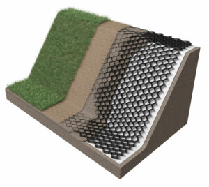 The permeable honeycomb structure of the Erosaweb geocell system has been developed for topsoil/stone retention on steep road embankment slopes. Once installed the geocellular structure forms a blanket of shallow pockets across the slope face into which fill is placed, protecting the slope and fill from erosion forces whilst allowing vegetation to establish for long-term protection.