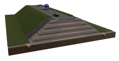 Fildrain geocomposites are used to create horizontal drainage layers at typically one metre vertical spacing for quick reduction of pore pressure. Compared to crushed stone, it is cost effective to install Fildrain at close spacings. Fildrain is also impermeable in the vertical plane which means that each layer protects the earthworks from the ingress of rainfall.