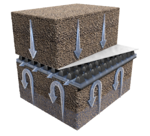 Pozibreak is designed specifically as a drainage void layer to protect the ground above from the capillary rise of moisture from below. The cuspated core maintains a void between clean and contaminated soils to prevent capillary action, while also providing very high multi-directional flow.