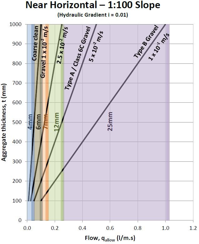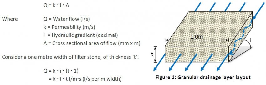 The specified permeability of filter stone typically varies from 10-1m/s to 10-4m/s and buried structures typically have hydraulic gradients of 0.01 to 1.0 (equivalent to near horizontal and vertical applications, respectively). So the maximum drainage capacity for a typical 300mm thick granular drainage layer can be anywhere in the range of 30 l/ms to 0.0003 l/ms.