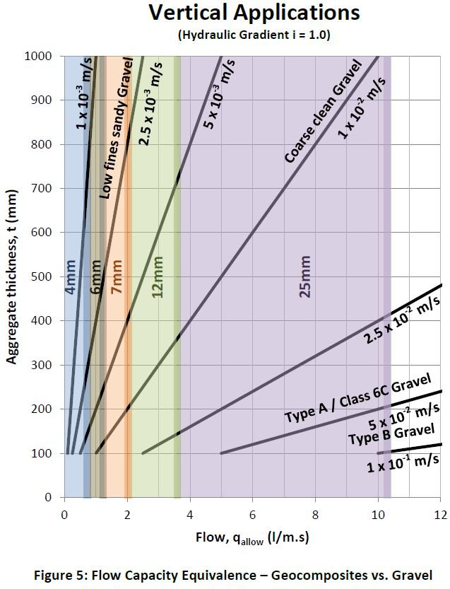 Note that the flow rates shown in Figure 5 assume that the granular layer is fully wrapped in a suitable geotextile or no-fines concrete to prevent fines migrating into the layer and that the granular material is highly resistant to abrasion/fragmentation. The flow rates shown for the granular layer therefore represent best case scenarios. The flow rates for the drainage geocomposites are based on our cuspated drainage geocomposites of various thicknesses under a pressure of 20kPa using soft foam platens.