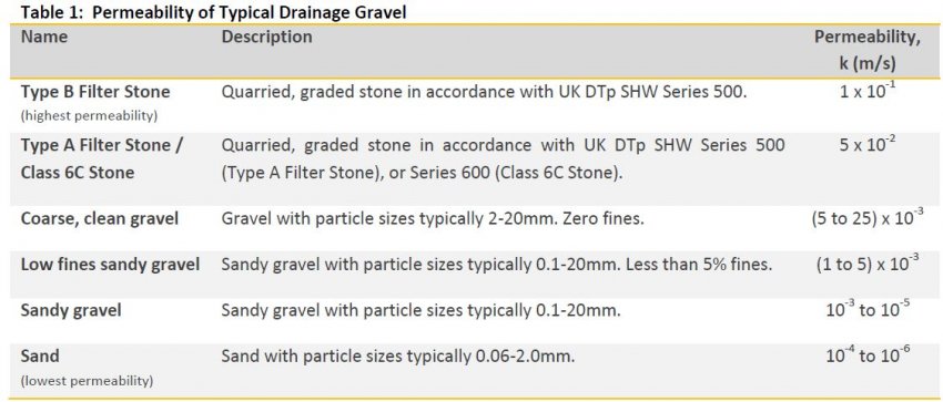 The permeability (k) of granular materials is typically measured in a laboratory and is reported as a value in m/s. Typical values of permeability for commonly used drainage gravels are shown in Table 1.