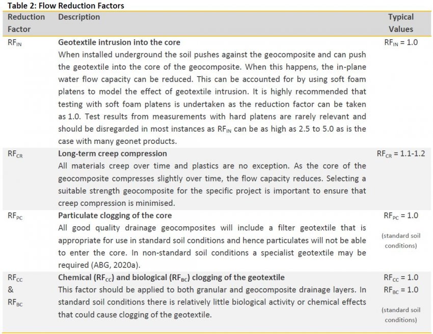 In addition to the reduction factors outlined above and in Table 2, a global factor of safety should be applied to both the granular filter flows and geocomposite flows to give the final design flows (Koerner, 2012).