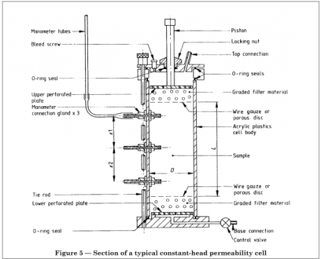 Soil permeability can be measured in the laboratory using the methods described in Chapter 5 of BS 1377-5:1990, or BS 1377-6:1990. On site the method of testing is essentially to fill a hole with water and time how long it takes to drain away using methods defined in BS 5930:2015, BRE DG 365, or NHBC: Chapter 5.3\