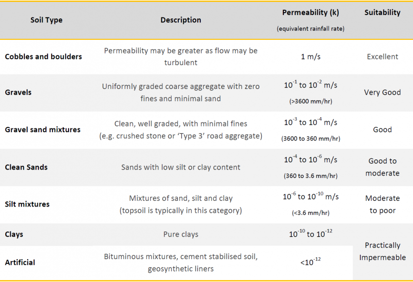 As soils are so varied, it is very difficult to give precise values for the permeability of a given soil without undertaking site specific tests. In the absence of site specific tests, a typical use is the Handbook of Geotechnical Investigation & Design Tables (Look, 2007). This information has been combined into Table 1, below, which includes equivalent rainfall rates to allow a better understanding of the sort of water flow rates that the various values of permeability correspond to.