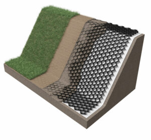 Geoceldas Erosaweb Todos están diseñados para confinar y estabilizar suelos de cobertura en pendientes pronunciadas y pueden fijarse o anclarse según sea necesario. La estructura alveolar del producto también reduce las velocidades de escorrentía del agua superficial para mitigar la erosión del suelo.