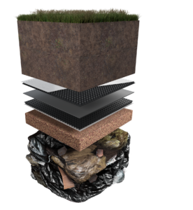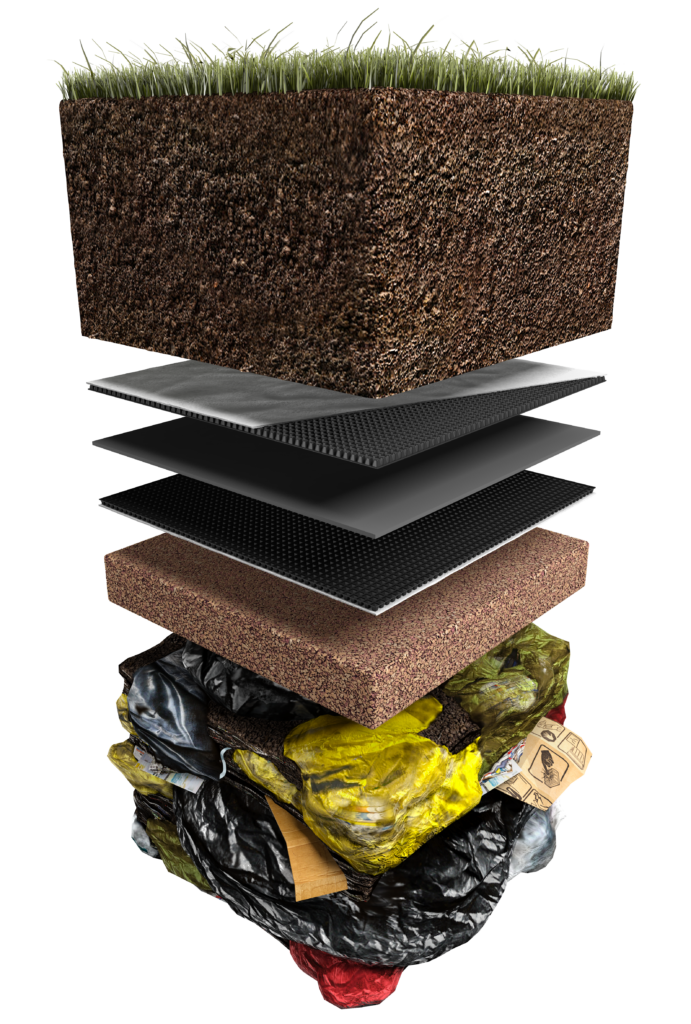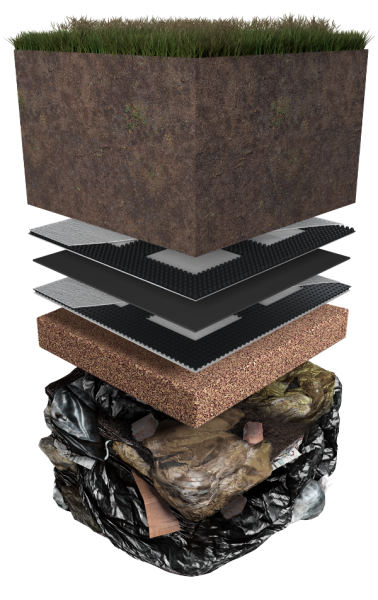 Pozidraín y Pozidrain G Los geocompuestos de drenaje en un sistema de cobertura de vertedero evitan la saturación de los suelos de cobertura al recolectar y drenar el agua de lluvia. Esto asegura que el suelo de cobertura permanezca estable y también actúa como una capa protectora para el geomembrana de tapado.