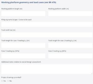 Las plataformas de trabajo son estructuras temporales formadas por relleno granular, normalmente de entre 300 mm y 800 mm de espesor, que proporcionan una base adecuada para que las plantas y maquinaria de construcción pesada realicen operaciones como levantamientos de grúas y pilotes. La base de agregado instalada para la plataforma está diseñada para reducir la presión impuesta sobre la formación subyacente a un nivel aceptable.